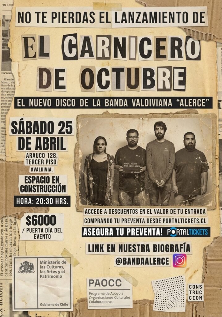 Con más de una década y media de trayectoria en la escena independiente del sur de Chile, la banda valdiviana Alerce anuncia el lanzamiento de su nuevo single “El carnicero de octubre”, primer adelanto de su cuarto álbum de estudio, que será publicado oficialmente el domingo 26 de abril de 2026.
