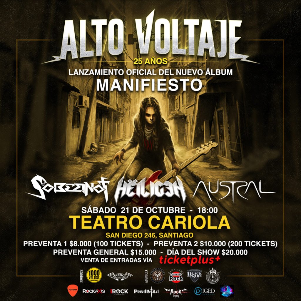El evento contará con invitados de lujo: Sobernot, Heiligen y Austral, quienes se encargarán de abrir los fuegos, para continuar con el estreno en vivo del cuarto disco de estudio de Alto Voltaje, llamado “Manifiesto”. Nuevo trabajo que, en sus líricas, narra los acontecimientos y vivencias de un barrio o población que podría ser de cualquier parte de Chile, sumado a todos los clásicos de la banda.
