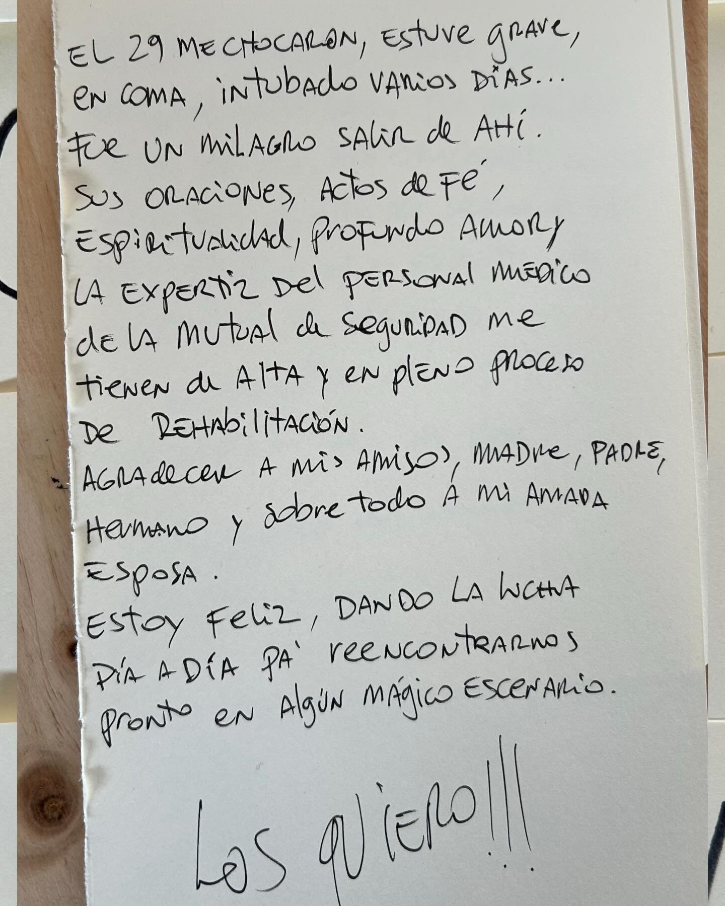 “Fue un milagro salir de ahí. Sus oraciones, actos de fe, espiritualidad, profundo amor y la experticia del personal médico de la Mutual de Seguridad me tienen hoy de alta y en pleno proceso de rehabilitación”, señala parte de la carta, escrita a puño y letra por Angelo. En el mismo mensaje, el músico también quiso expresar su gratitud: “Agradecer a mis amigos, a mi madre, a mi padre, a mi hermano y, sobre todo, a mi amada esposa”.