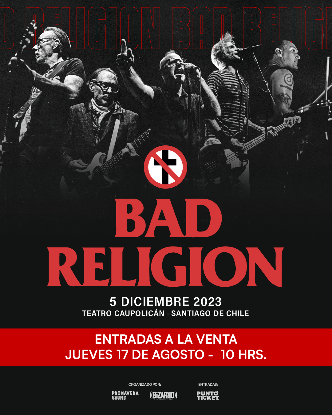 A cuatro años de su última visita a Sudamérica, la banda Bad Religion confirmó su visita a Chile para presentarse esta vez en el Teatro Caupolicán. La cita será el martes 5 de diciembre del presente año, para lo cual los fanáticos de esta leyenda de la música ya se preparan para cantar los éxitos que acompañan la trayectoria de los músicos originarios del sur de California en Estados Unidos.