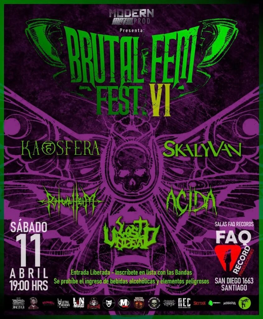 Santiago se prepara para una noche de furia y potencia femenina con la sexta edición del Brutal Fem Fest, que se realizará el próximo sábado 11 de abril de 2026 a las 19:00 hrs en Sala FaqRecord (San Diego 1663). Con entrada liberada, este festival se ha consolidado como un espacio fundamental para visibilizar a las mujeres en la escena del metal extremo chileno.