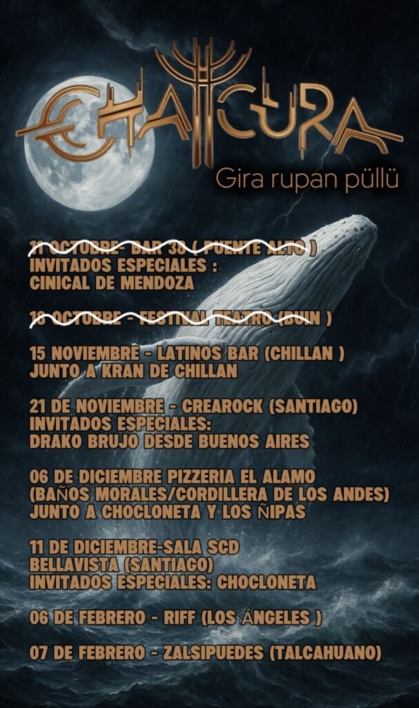 La banda chilena Chaicura, reconocida por su potente propuesta de rock/metal fusionado con la cosmovisión mapuche, dio inicio a su gira “Rupan Püllü” con exitosas presentaciones el pasado 11 y 18 de octubre en Bar 38 (Puente Alto) y en el Festival de Teatro de Buin, marcando así el comienzo de una nueva etapa creativa y de una serie de conciertos que los llevará por diversas ciudades de Chile y Argentina.