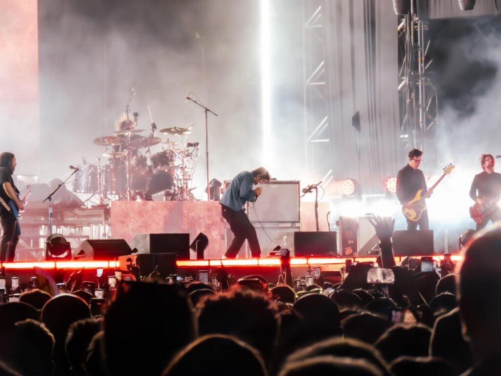 Pero la verdadera combustión emocional llegó cuando comenzaron a aparecer los pilares de su historia. Diamond Eyes y Rocket Skates encendieron definitivamente la audiencia, recordando que la banda domina ese equilibrio extraño entre agresividad y belleza atmosférica. Cada riff era celebrado con la intensidad de quienes llevan años esperando estos momentos. Luego llegó uno de los pasajes más delicados del set. Cuando sonó Sextape, el ambiente cambió por completo y el parque se transformó en un espacio suspendido entre nostalgia y contemplación. Las guitarras flotaban sobre el anochecer mientras miles de voces acompañaban en un coro casi íntimo. Fue uno de esos instantes en que la música parece detener el ruido del mundo.