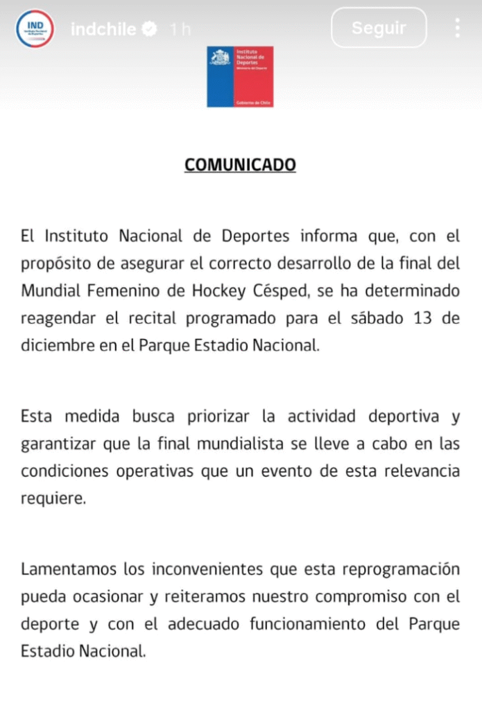 En un comunicado, el IND explicó la determinación: “Esta medida busca priorizar la actividad deportiva y garantizar que la final mundialista se lleve a cabo en las condiciones operativas que un evento de esta relevancia requiere. Lamentamos los inconvenientes que esta reprogramación pueda ocasionar y reiteramos nuestro compromiso con el deporte”.
