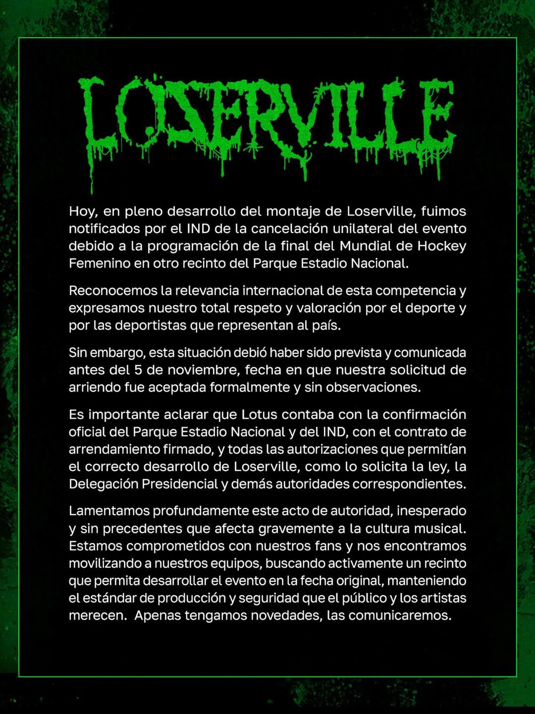 Los organizadores del evento LOTUS ha emitido un comunicado oficial aludiendo a que contaban con los contratos firmados y la autorización del recinto y del IND para que el evento de realizará sin problemas, y que esta “decisión unilateral” por parte del IND “afecta a la cultura de nuestro país”.