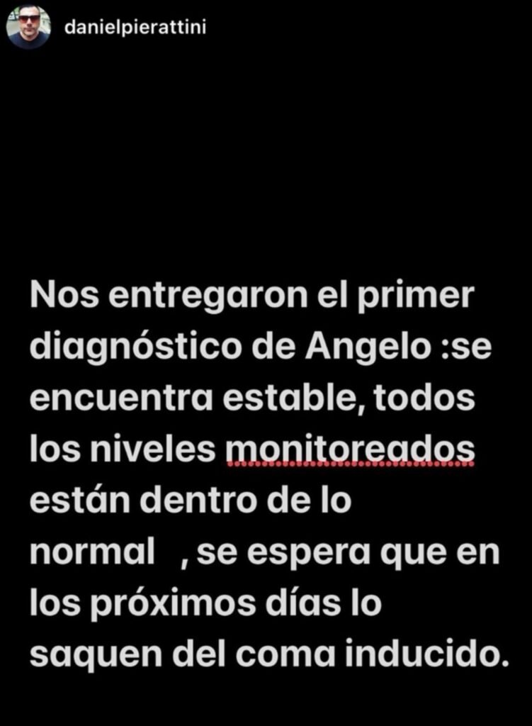 A través de redes sociales, Daniel Pierattini informó que el músico se encuentra “estable y con niveles normales”. Además, indicó que, de seguir la evolución positiva, “se espera que en los próximos días lo saquen del coma inducido”.