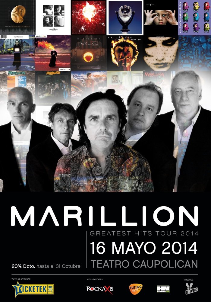 Marillion ya confirmó su próxima gira latinoamericana Greatest Hits Tour, la que incluye a nuestro país, además de Cuidad de México, Sao Paulo, Rio de Janeiro y Buenos Aires. El tour está enfocado en recorrer los éxitos emblemáticos de sus 33 años de carrera, pero también ofrecerán en vivo una muestra de lo que figura en su último disco de estudio, “Sounds that can’t be made“, que fue lanzado a mediados de septiembre pasado.