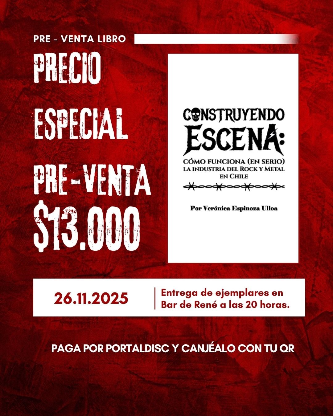 La periodista musical Verónica Espinoza anunció la pre-venta de su nuevo libro “Construyendo escena: cómo funciona (en serio) la industria del rock y metal en Chile”, cuya entrega presencial para quienes lo adquieran por Portalticket se realizará el miércoles 26 de noviembre a las 20 horas en Bar de René, ubicado en Santa Isabel 369, Providencia.