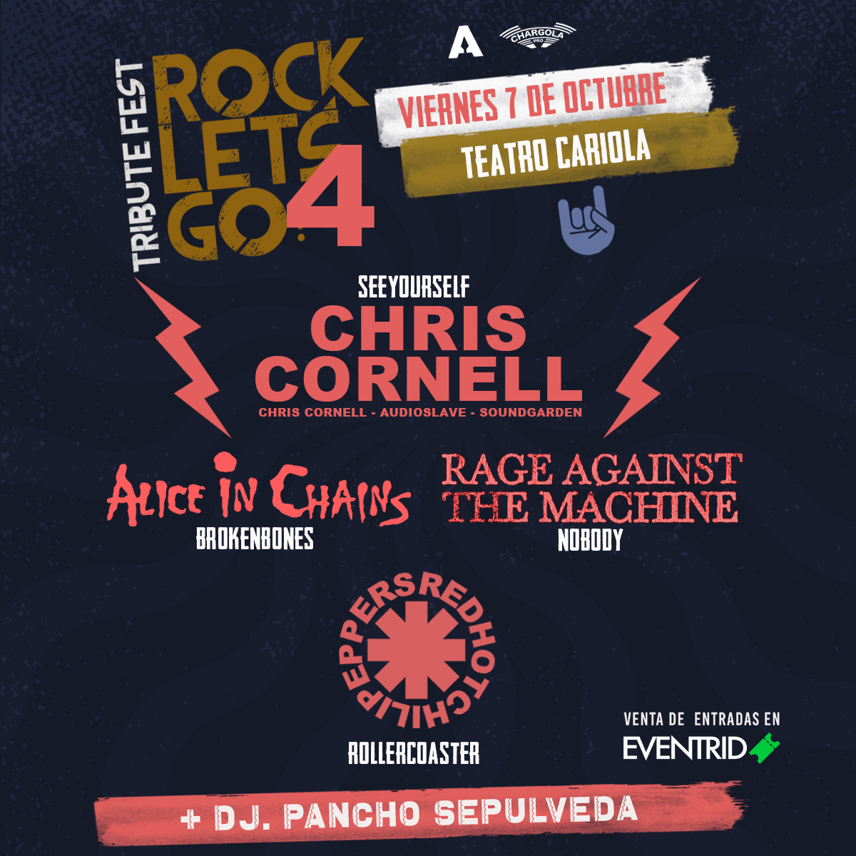 El sonido del rock alternativo de que marcó la década de los 90’s y principios el nuevo milenio se toma el Teatro Cariola, el próximo viernes 7 de octubre a partir de las 19 horas, y contará con la participación de: SEEYOURSELF con los clásicos de CHRIS CORNELL en su carrera como solista y sus bandas AUDIOSLAVE y SOUNDGARDEN; BROKENBONES, tributando a ALICE IN CHAINS; NOBODY, con los grandes éxitos de RAGE AGAINST THE MACHINE y ROLLERCOASTER con RED HOT CHILI PEPPERS.