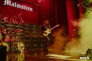 El escenario, decorado con una impactante muralla de amplificadores Marshall apilados, sirvió de fondo perfecto para una ejecución intensa y milimétrica. En uno de los momentos más comentados, Malmsteen —con su delgada figura ya habitual entre sus seguidores— repartía uñetas al público a punta de patadas, una marca registrada de su show.